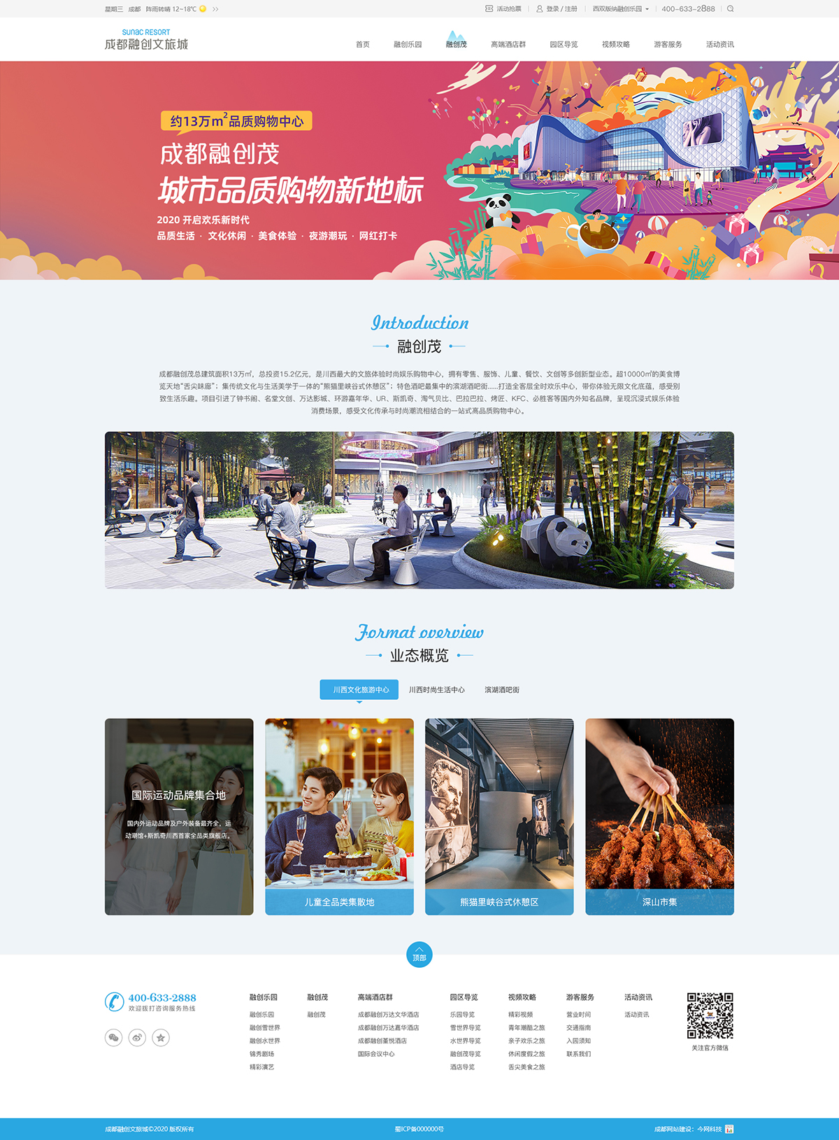 成都融创文旅城,是融创文旅集团重点打造的世界级特大型文化旅游商业综合项目,总投资约500亿,总占地面积约5000亩,包括文化旅游和地产。其中,文旅区投资约150亿,占地约1600亩,由八大业态融创乐园、融创雪世界、融创水世界、成都锦秀、豪华酒店集群、国际会议中心、风情商业街和融创茂组成,是集多元产业与一体的世界级综合旅游度假目的地。成都融创文旅城的建成将全面升级整个四川的旅游格局,将形成“问道青城山、拜水都江堰、欢聚文旅城”的西部文旅新三角,为世界带来更高品质、更全业态、更多欢乐的家庭度假新体验。